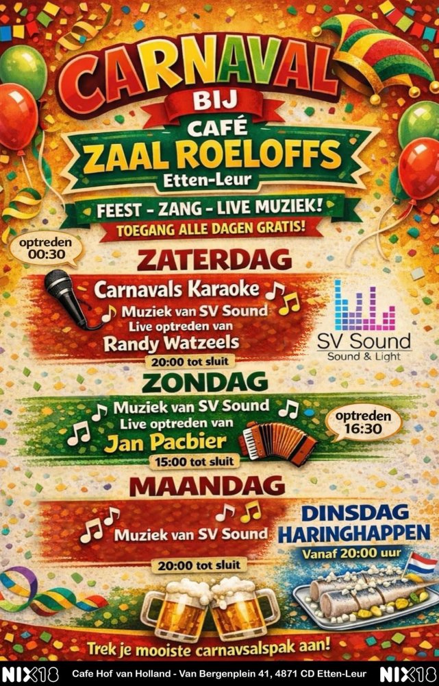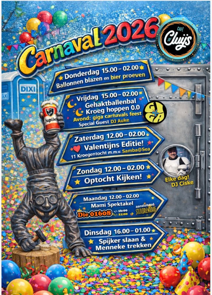 -Zes dagen carnaval, van donderdag t/m dinsdag. Alle dagen DJ Ciske en diverse extra's.