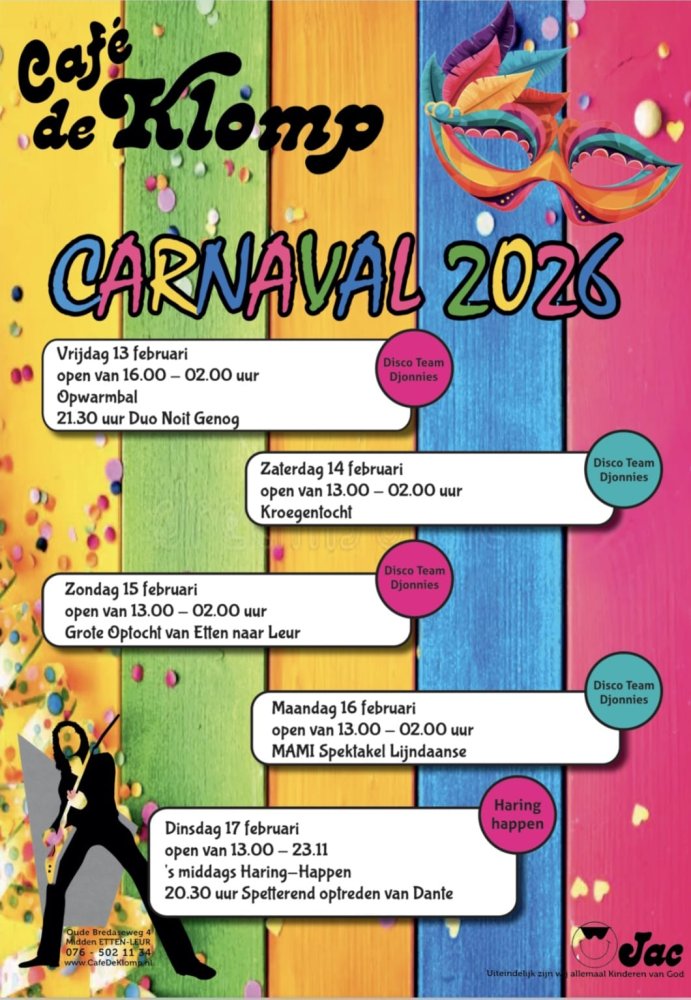 - Vijf dagen carnaval (van vrijdag t/m dinsdag) met Disco Team Djonnies, een live optreden van duo Noit Genog en Dante Deterala (bekend van Sint Willebrord, het Mirakel van Brabant). Lees meer>>