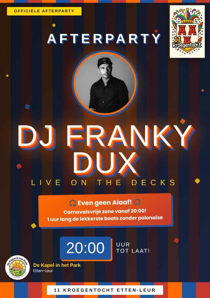 - Donderdag 12 februari: Vrouwkusbal, vanaf 20.00 uur. Tickets>> - Vrijdag 13 februari: DJ Melvin, vanaf 20.00 uur. - Zaterdag 14 februari: In de middag 11 Kroegentocht met live muziek van Marco de Hollander om 15.30 uur en vanaf 20.00 uur Officiële 11 Kroegentocht Afterparty met DJ Franky Dux en DJ Stefan. - Zondag 15 februari: Na de start van de optocht Net als toen met Het Karrekot Trio. - Maandag 16 februari: Programma volgt - Dinsdag 17 februari: Gehandicaptenmiddag