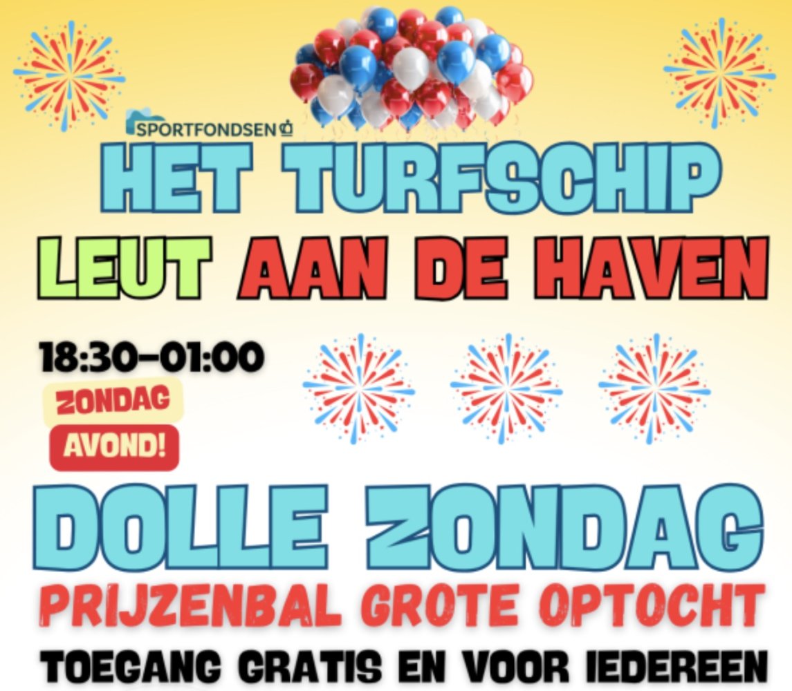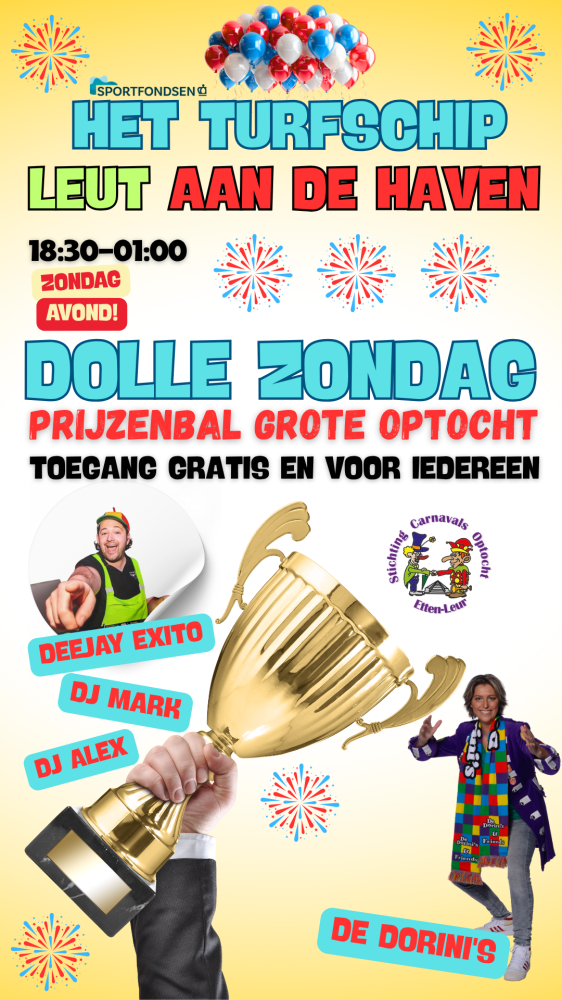 Dolle Zondag en prijzenbal Grote Optocht in Het Turfschip zondag, 15 februari 18:30 Het Turfschip Etten-Leur Toegang gratis voor iedereen. Lees verder Op zondag 15 februari is het Dolle Zondag en Prijzenbal in Het Turfschip. Gekoppeld is namelijk de prijsuitreiking van de Grote Optocht.Toegang gratis voor iedereen. Schipperstraat 2, 4871 KK Etten-Leur