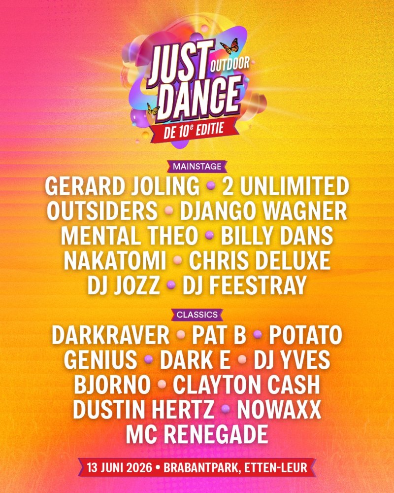 Zaterdag 13 juni staat het Brabantpark in Etten-Leur weer volledig in het teken van hét gezelligste festival van Nederland. We dansen, zingen én feesten weer op de dikste muziek tijdens Just Dance Outdoor! Mainstage: 𝗚𝗲𝗿𝗮𝗿𝗱 𝗝𝗼𝗹𝗶𝗻𝗴 • 𝟮 𝗨𝗻𝗹𝗶𝗺𝗶𝘁𝗲𝗱 • 𝗢𝘂𝘁𝘀𝗶𝗱𝗲𝗿𝘀 • 𝗗𝗷𝗮𝗻𝗴𝗼 𝗪𝗮𝗴𝗻𝗲𝗿 • 𝗠𝗲𝗻𝘁𝗮𝗹 𝗧𝗵𝗲𝗼 • 𝗕𝗶𝗹𝗹𝘆 𝗗𝗮𝗻𝘀 • 𝗡𝗮𝗸𝗮𝘁𝗼𝗺𝗶 • 𝗖𝗵𝗿𝗶𝘀 𝗗𝗲𝗹𝘂𝘅𝗲 • 𝗗𝗝 𝗝𝗼𝘇𝘇 • 𝗗𝗝 𝗙𝗲𝗲𝘀𝘁𝗿𝗮𝘆
