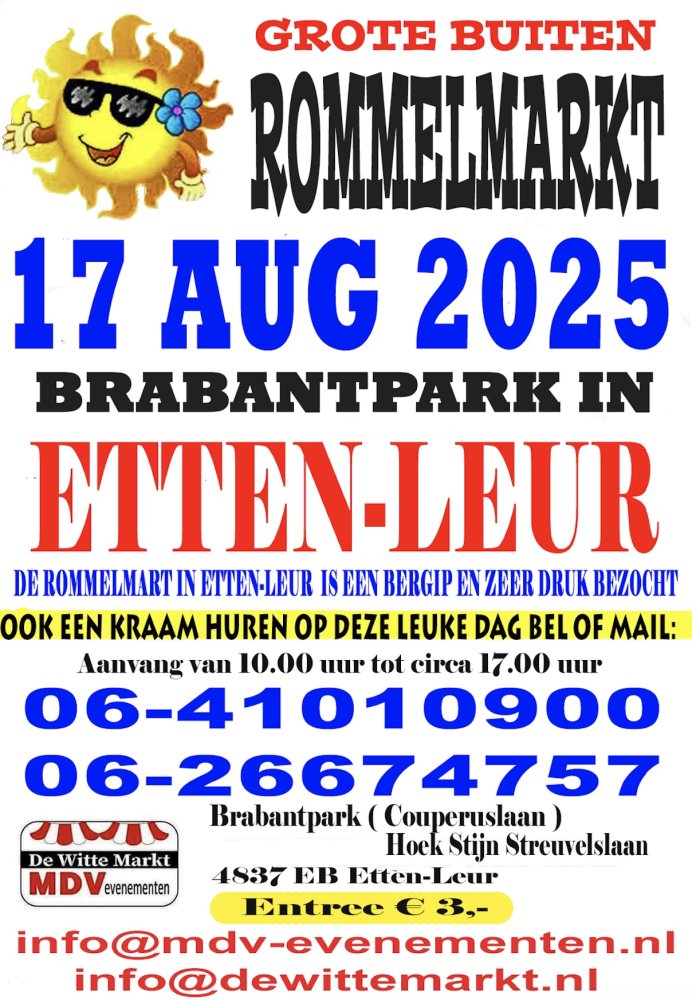 De jaarlijkse bekende BUITEN ROMMELMARKT in het Brabantpark in Etten-Leur vindt dit jaar plaats op zondag 17 augustus. Dit is de dag waarop in het centrum ook de Profwielerronde wordt verreden.
