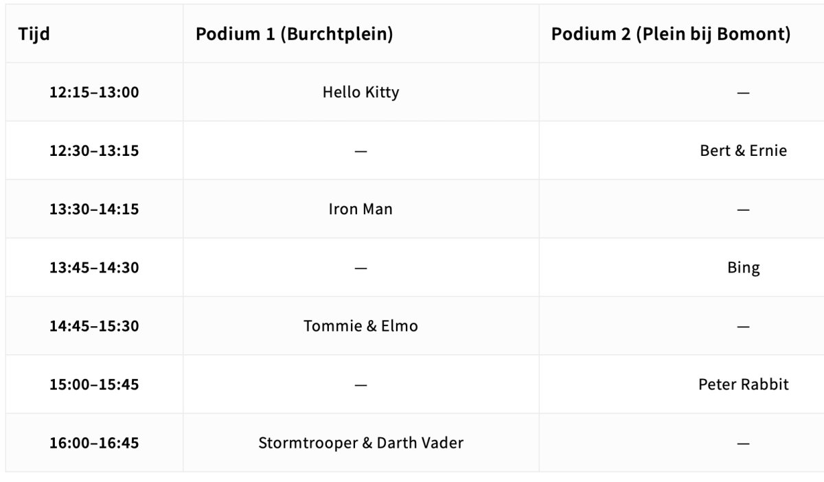 Niets is waardevoller dan die stralende ogen wanneer je kindje oog in oog staat met zijn of haar held. Dankzij de kleinere podia heb je extra veel tijd voor een praatje, een knuffel of die perfecte foto. Loop tussendoor even naar je favoriete winkel, pak een cool ijsje en maak er een complete dag van!