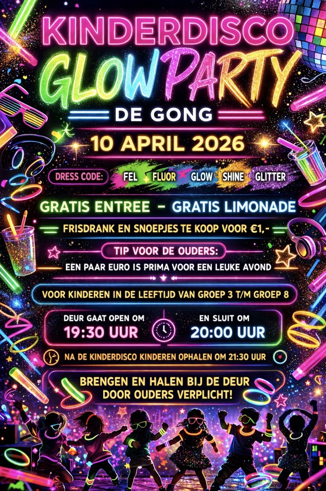 Het is weer tijd voor de volgende kinderdisco, en wat voor één.... De kinderen gaan letterlijk 'shinen' en swingen tijdens deze Glowparty-editie. Natuurlijk gaan we er weer een geweldig feestje van maken. De kinderen mogen komen in hun coolste outfit vol felle fluor kleuren, glowsticks, glitter, enz. Niks is te gek!