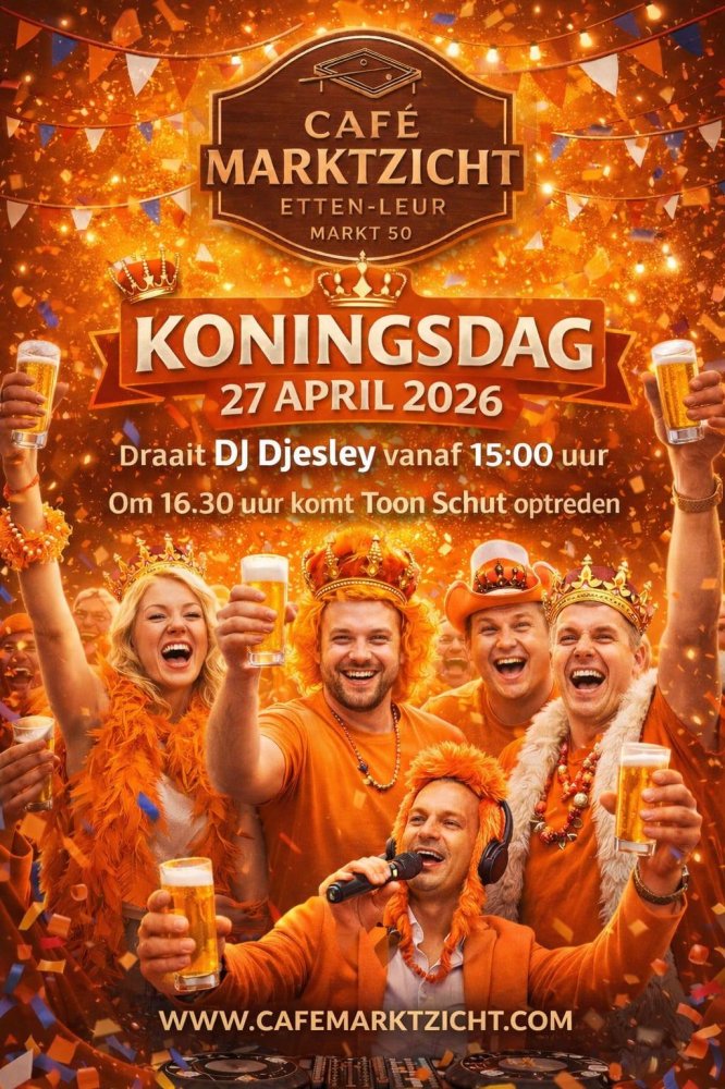 Koningsanacht en Koningsdag bij Marktzicht zondag, 26 april 19:00 Café-zaal Marktzicht Etten-Leur Dag en nacht feest bij Marktzicht Lees verder Koningsnacht, zondag 26 april vanaf 19.00 uur bij Marktzicht muziek van SV Sound.Op Koningsdag draait DJ Djesley vanaf 15.00 uur en is er om 16.30 uur een optreden van Toon Schut. Markt 50, 4875 CG Etten-Leur