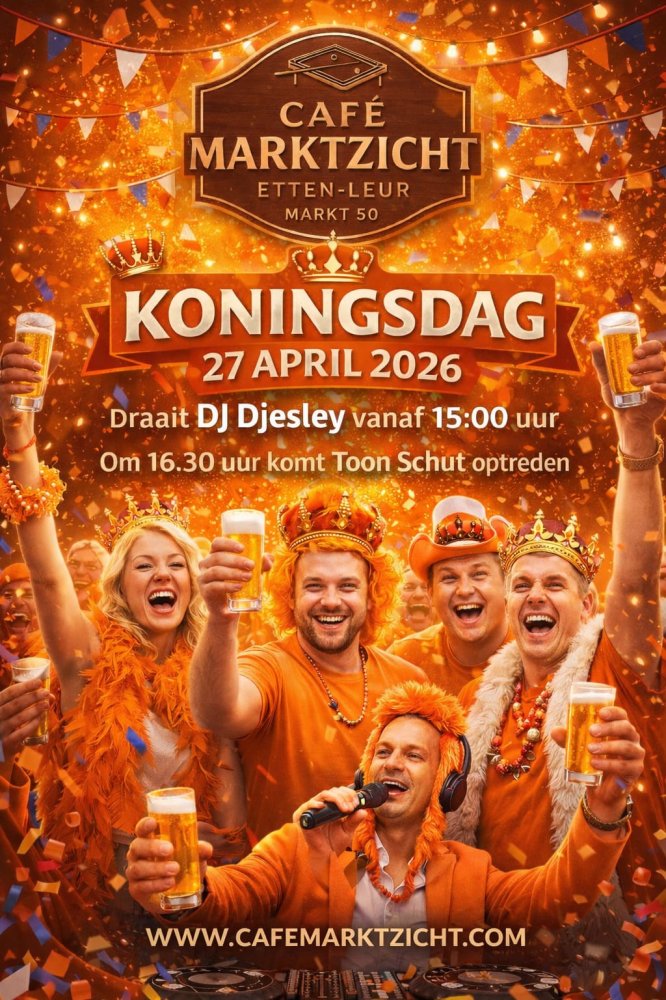 Koningsdag bij Marktzicht maandag, 27 april 15:00 Café-zaal Marktzicht Etten-Leur Om 16.30 uur gaan we los met een optreden van Toon Schut. Lees verder KoningsdagMaandag 27-04-2026 | 15:00 - 20:00Entree: GratisDeze dag verdient een kroon! Vanaf 15 uur DJ Djesley, om 16.30 uur gaan we los met een optreden van Toon Schut. Markt 50, 4875 CG Etten-Leur