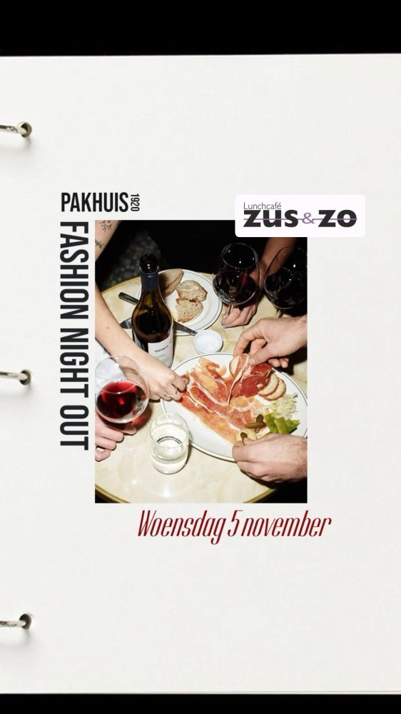 Locatie: ZUS&ZO | Party editie | Woensdag 5 november | Doors open 18:30 / start: 19:00 | Hapjes met lekkere wijnen | Fashionshow | Loterij | Late night shopping at Pakhuis 1920 | tickets: €30,-