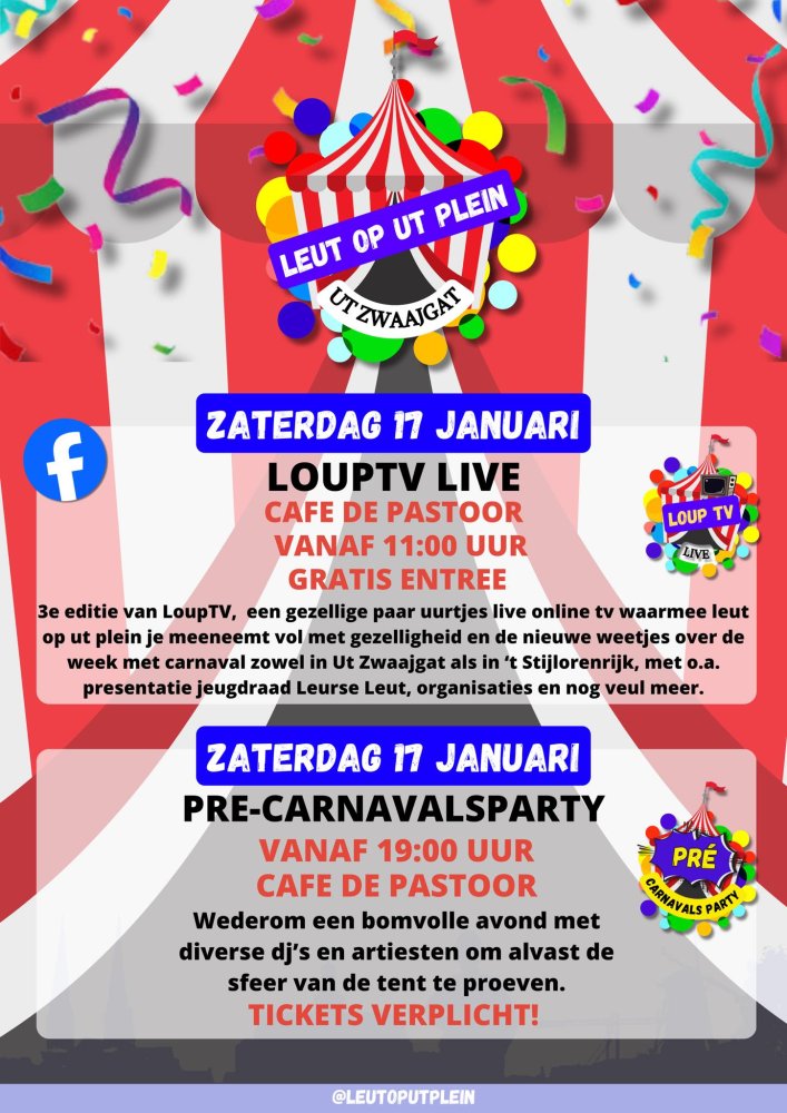 Op 17 januari vindt bij De Pastoor de Pre-Carnavalsparty voor Leut op ut plein plaats. Het begint om 19.00 uur. Een avond vol muziek en live artiesten. Om alvast in de stemming te komen.