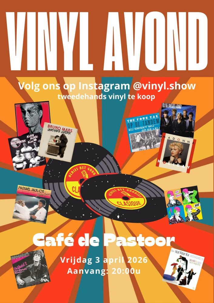 Vinyl Avond bij De Pastoor vrijdag, 3 april 20:00 Café-Zaal De Pastoor Jan Lambregts & Bart Klep draaien alles wat ooit op vinyl is uitgekomen. Lees verder Al jaren een groot succes: de Vinyl Avond bij De Pastoor.Jan Lambregts & Bart Klep draaien alles wat ooit op vinyl is uitgekomen. Van wereldartiesten tot lokale helden, alles komt voorbij!Er is ook tweedehands vinyl te koop.Op 3 april vanaf 20.00 uur. Lange Brugstraat 15, 4871CL Etten-Leur