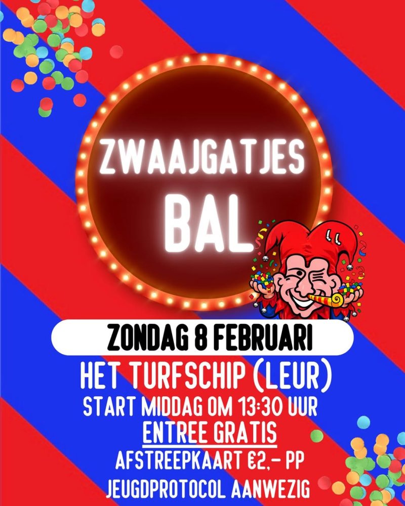 Op zondag 8 februari aanstaande maakt karnavalsvereniging Leurse Leut een vliegende start met het Zwaajgatjesbal, het bekende Leurse kinderkarnaval. Vanaf 14.00u is er van alles te doen in het Turfschip.