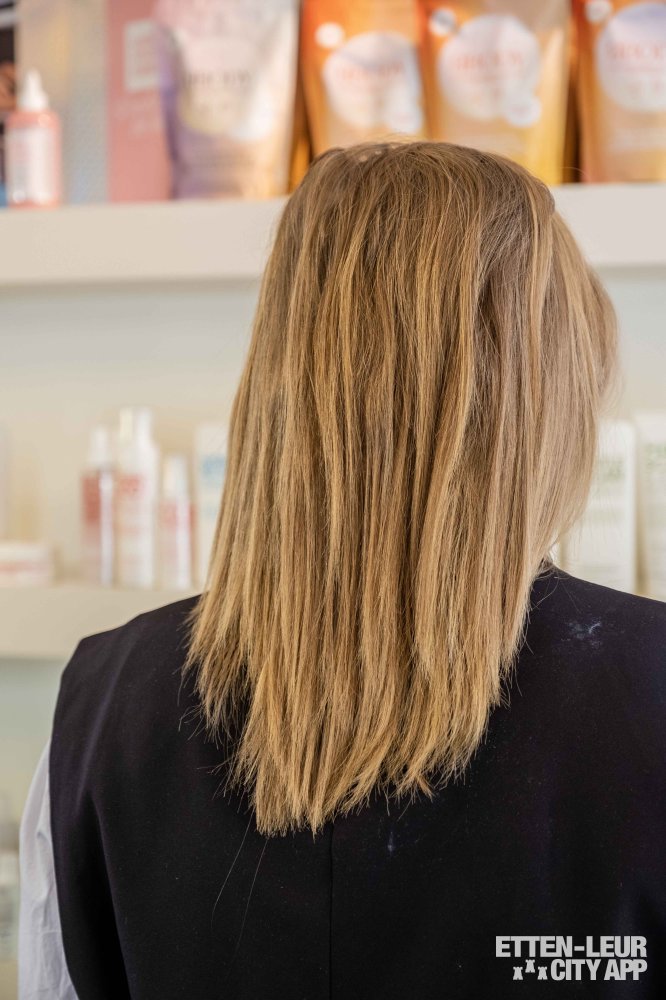 De tweede stap gaat verder met de Bond Perfector. De Olaplex No. 2 Bond Perfector zorgt ervoor dat beschadigd haar direct behandeld en hersteld wordt, zonder dat het ten koste gaat van andere behandelingen zoals het blonderen, verven en permanenten. Zo krijg je het sterkste, meest glanzende en gezondste haar dat mogelijk is! De Bond Perfector moet wat langer intrekken dan zijn voorganger, 20 minuutjes. Na deze 20 minuten is het tijd om het uit te spoelen. We mogen plaats nemen bij de wastafel en genieten hier van de ontspannende massage die de stoel geeft. Het haar heeft op dit moment al zoveel glans en voelt zacht aan.